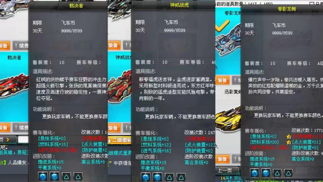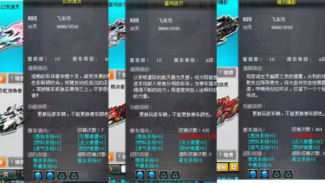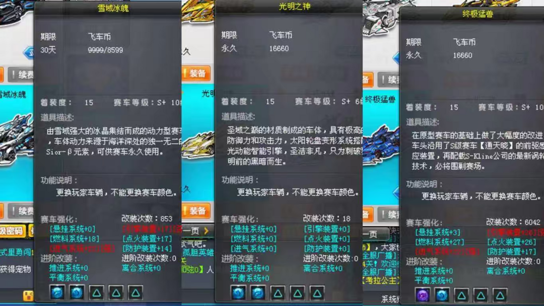 装备描述:6S爆天甲耀影七阶全二九双四三三 众神之神双皮肤麒麟 哪吒 全二九双四三三 黑鱼电摩玄冥四级重生 终极猛兽 高改 四级重生 雪域冰魄中改双三 3T1青蜂侠中改双三 圣龙骑士 沙暴 19A雷诺全二九双三幻夜五阶 樱语全套 瓦力 腾龙 惩戒等 裁决者 幻变速灵 暗羽魔影 星河战刃 海神之吻 幻能黄金 春运龙翔 神威战虎等全部双三... C车等