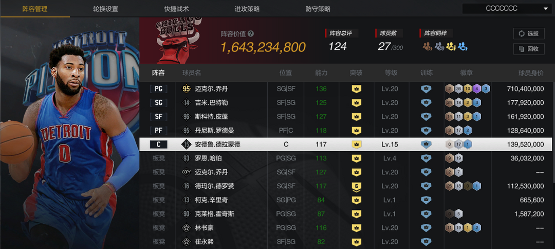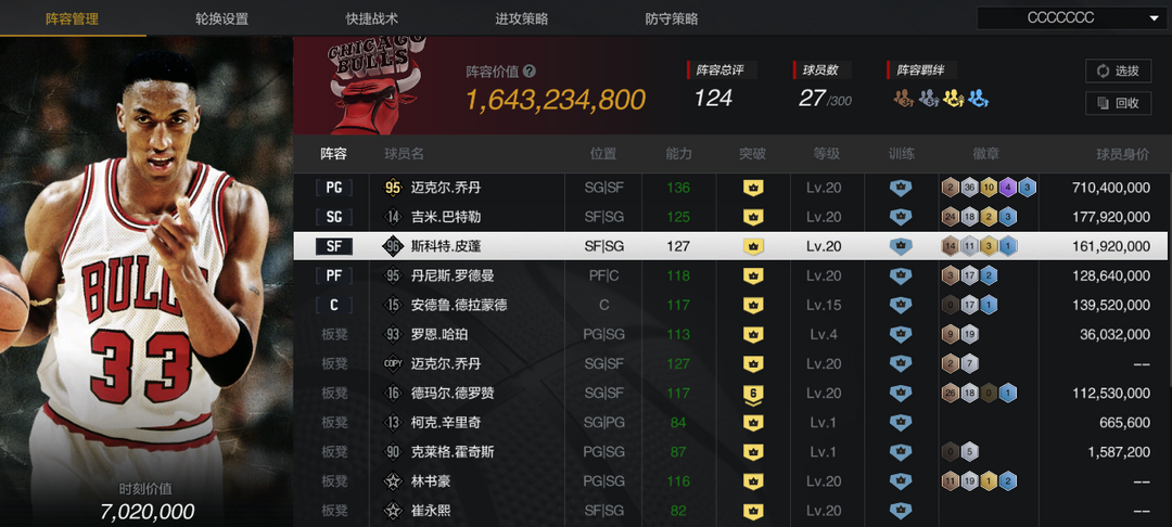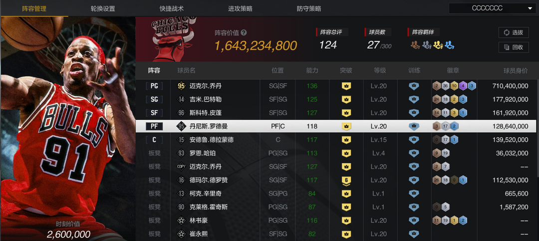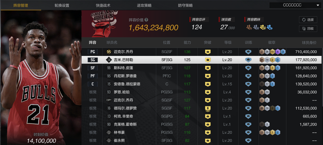 限制: 撤单率<50%才可租用此帐号装备描述:【巅峰公牛套】【10三时刻乔丹】【10庄神/哈珀】【10时刻巴特勒/皮蓬/罗德曼】【6时刻德罗赞】