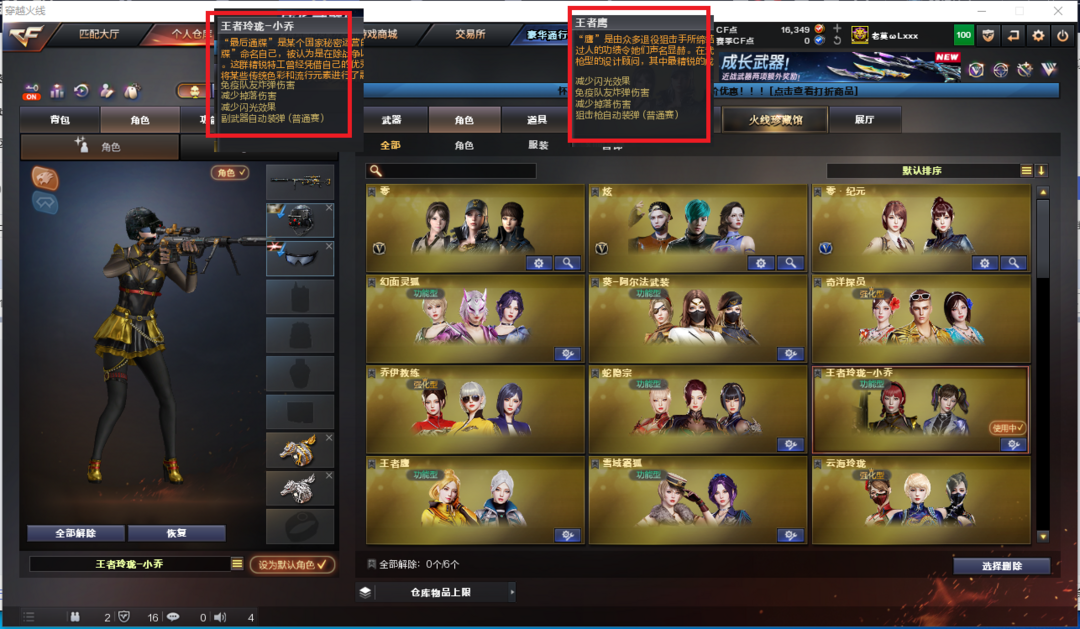 装备描述:排位:可以、、、、、、、、、爆破四防:幻神+幻神音效卡、USP雷暴、COP雷霆、白虎、QBZ金色蔷薇、、、幻神音效、雷神音效、毁灭音效、、、5套雷霆、5套雷暴、3套神工天巧、、、爆破四防(王者小乔、王者鹰)