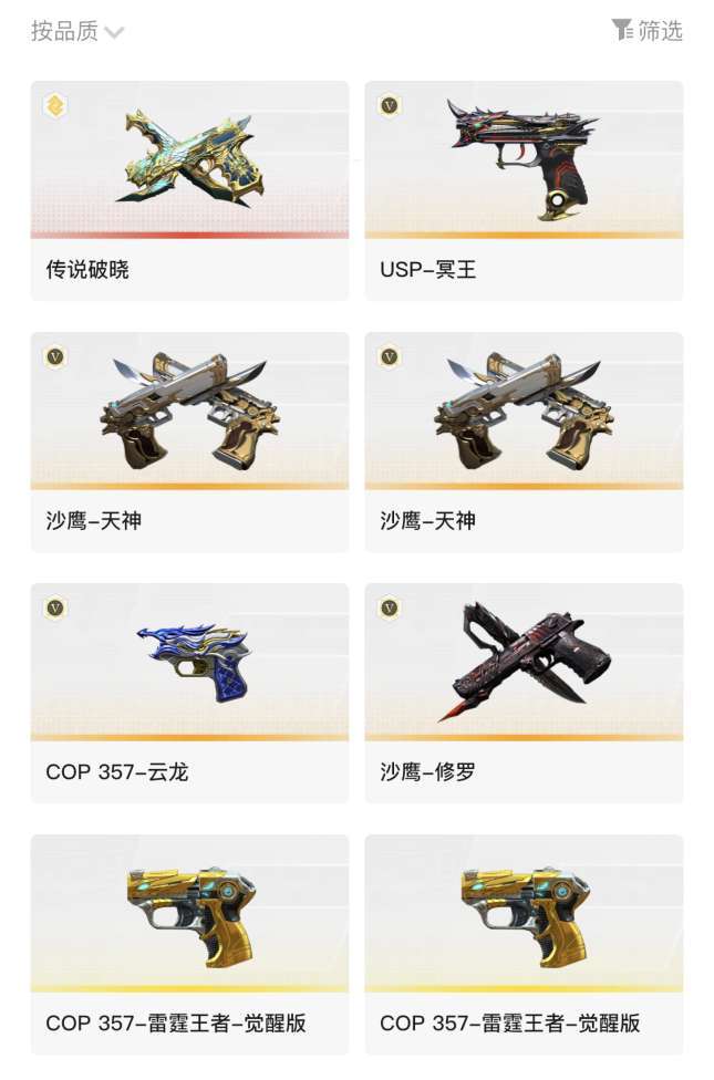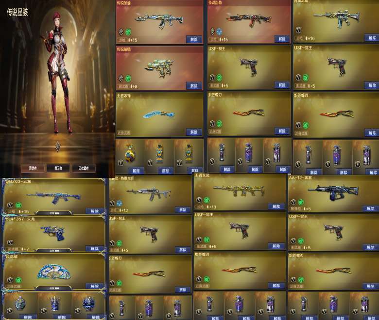 装备描述:5个传说,传说星骇,传说圣谕,传说破晓,传说浩劫,冥王, 狙:带皮幻神,带卡裁决,竞技荣光,王者雷霆大炮,王者96k ,王者玄武。英雄级喷子,炽芒蝶刃蝴蝶刀。副武器:全英雄cop,冥王usp,英雄级雷包。传说人物。目前荣耀30豆左右