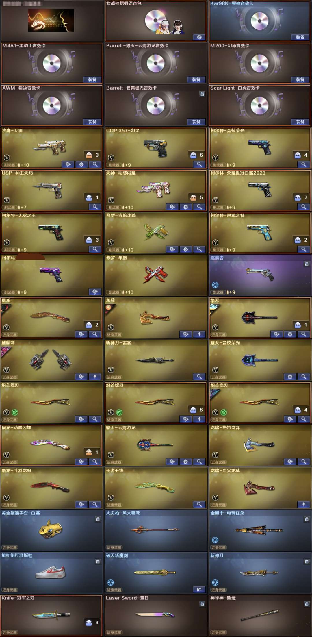 装备描述:南部生化号,带点小爆破,7烈龙6盘龙,3把蝴蝶刀两个皮肤,小人枪有 斯太尔蝴蝶 炼狱狮子,人物是神威莲华,虹儿,爽吃生化,爆破主流武器都有