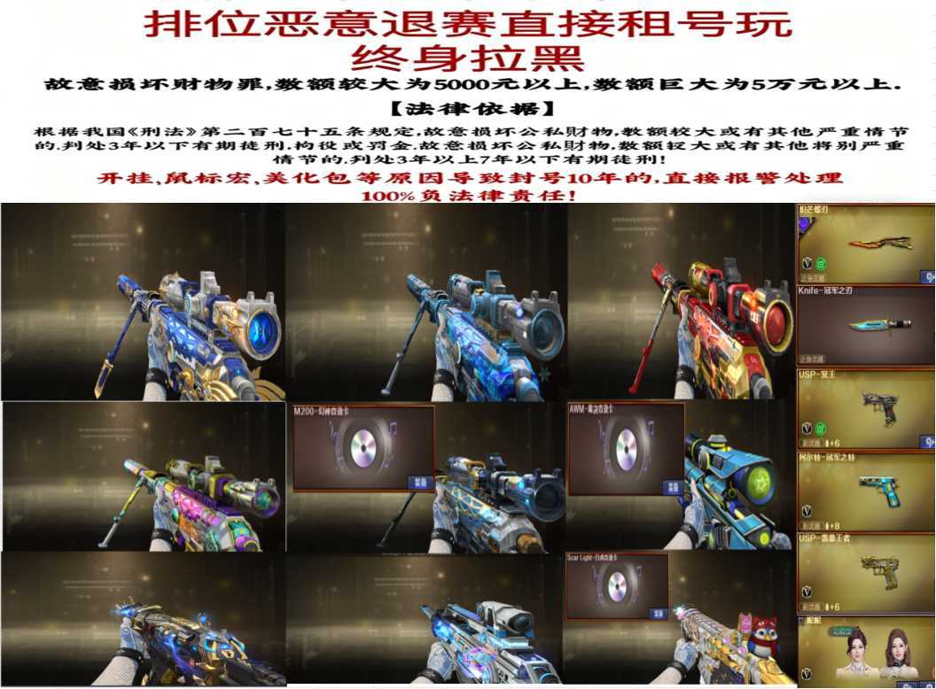限制: 租号1次及以上 | 撤单率<90%才可租用此帐号装备描述:此号已在当地派出所备案,如有开挂科技选手,必找平台索要租客信息,找团队律师控告到底!