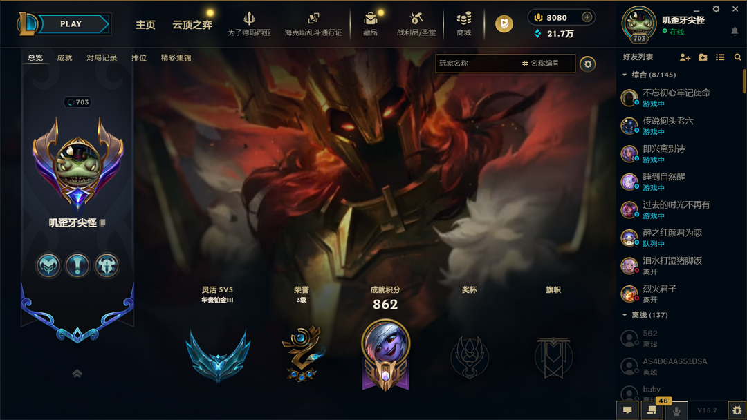 装备描述:诺克萨斯703级铂金号 小炮大头提莫皮肤多 含铁男圣堂级皮肤以及薇恩殿堂传奇神话级皮肤 随意出租玩开心最重要