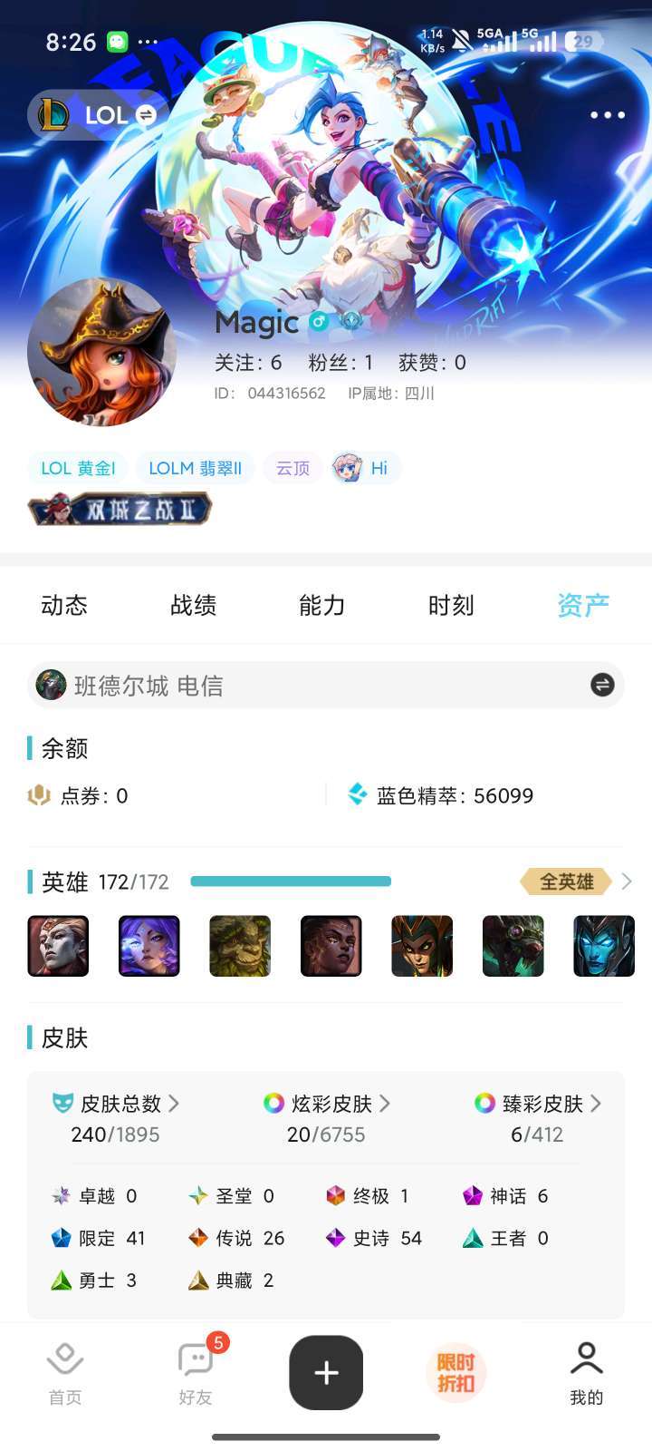 终极皮肤1个,神话皮肤6个,限定皮肤41个,传说皮肤26个,总皮肤240个,精粹56099全英雄