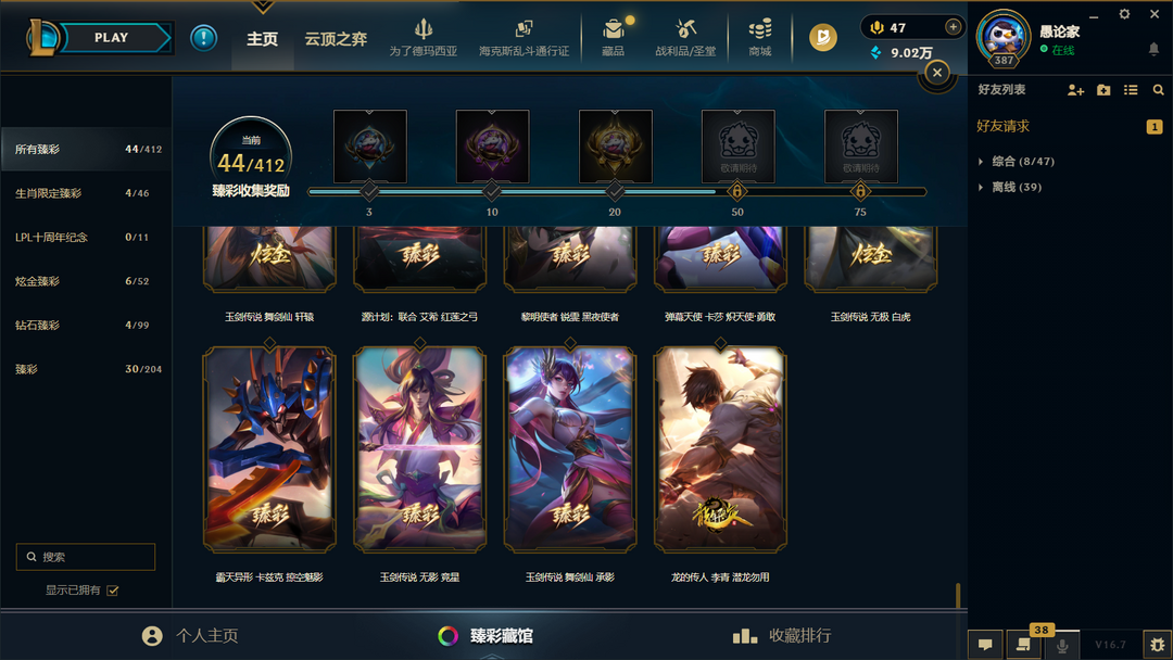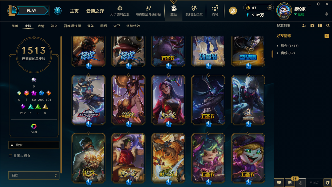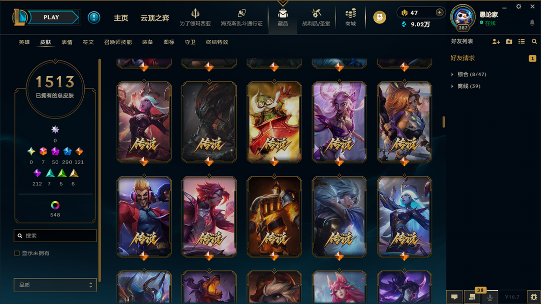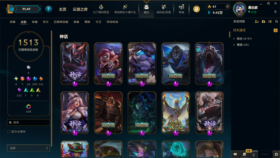 神话幻想诺手⭐盖伦⭐女枪1513原皮终极全50神话292限定121传说44臻彩