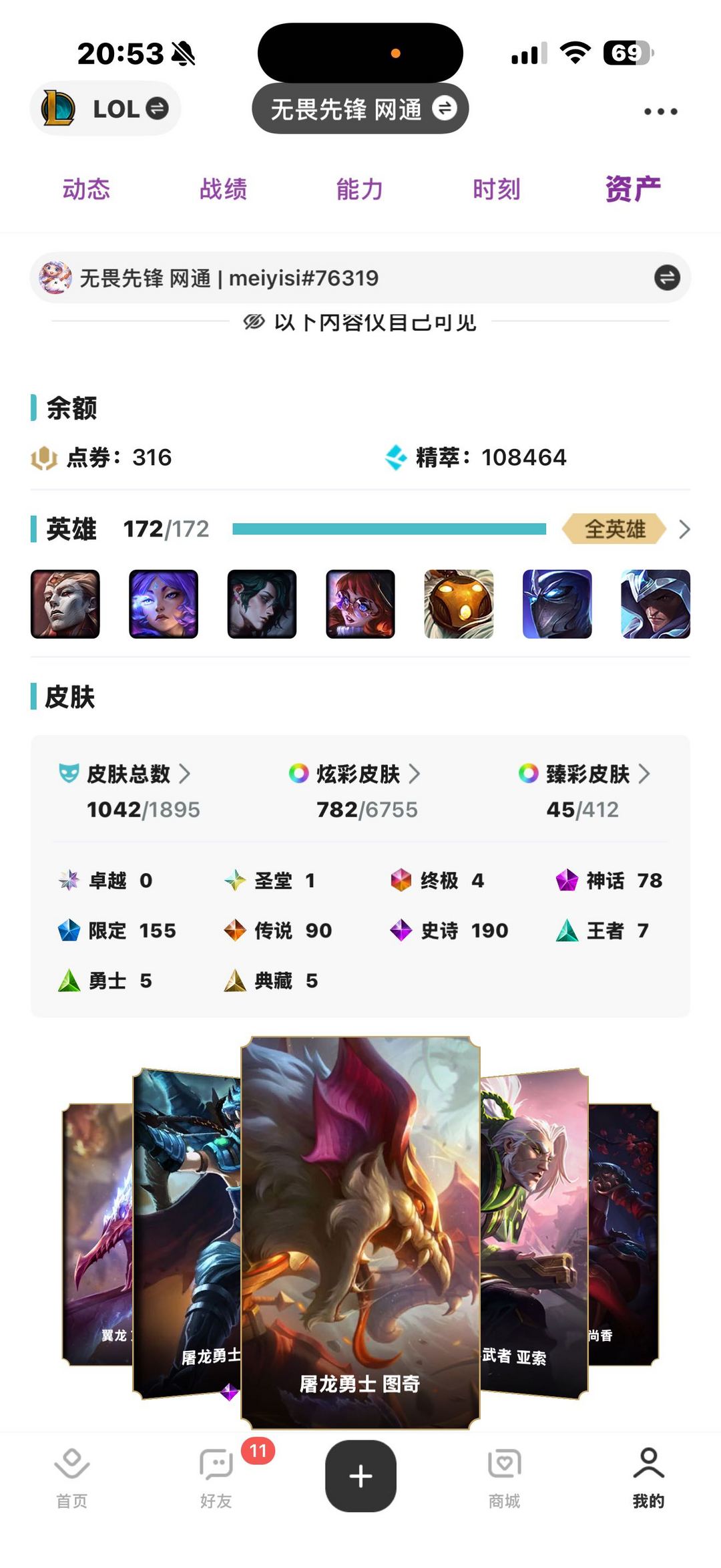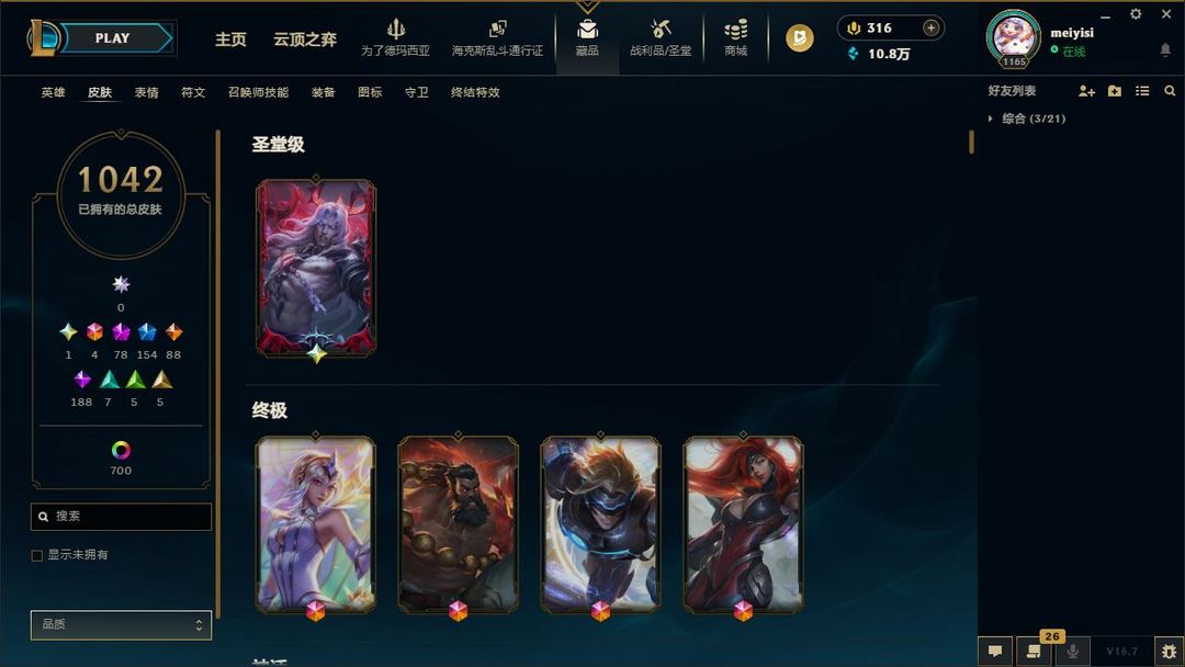 真实1042皮肤 海斗乱斗 高分慎选 王佛耶戈 神话沉溺暗影卢锡安 圣洁神王诺手 云顶至臻格温女仆棋