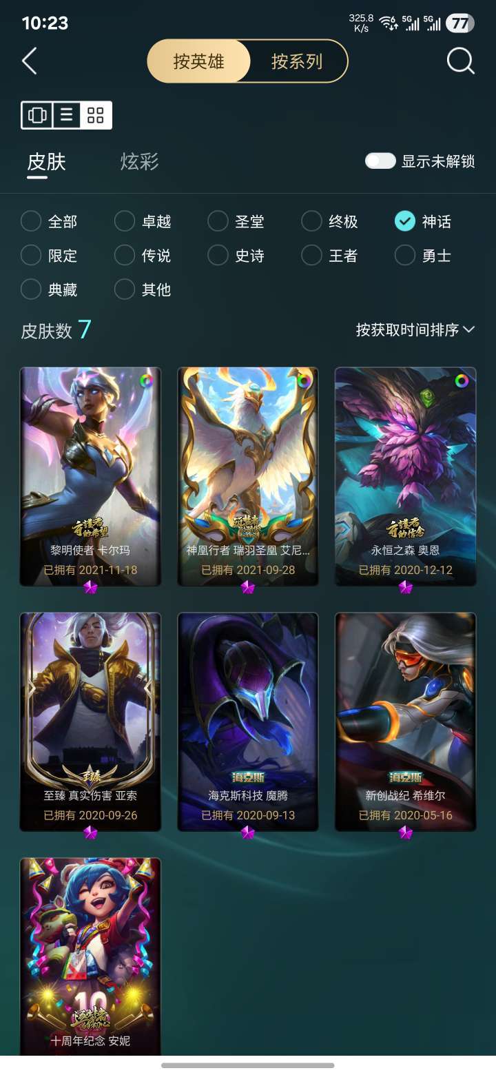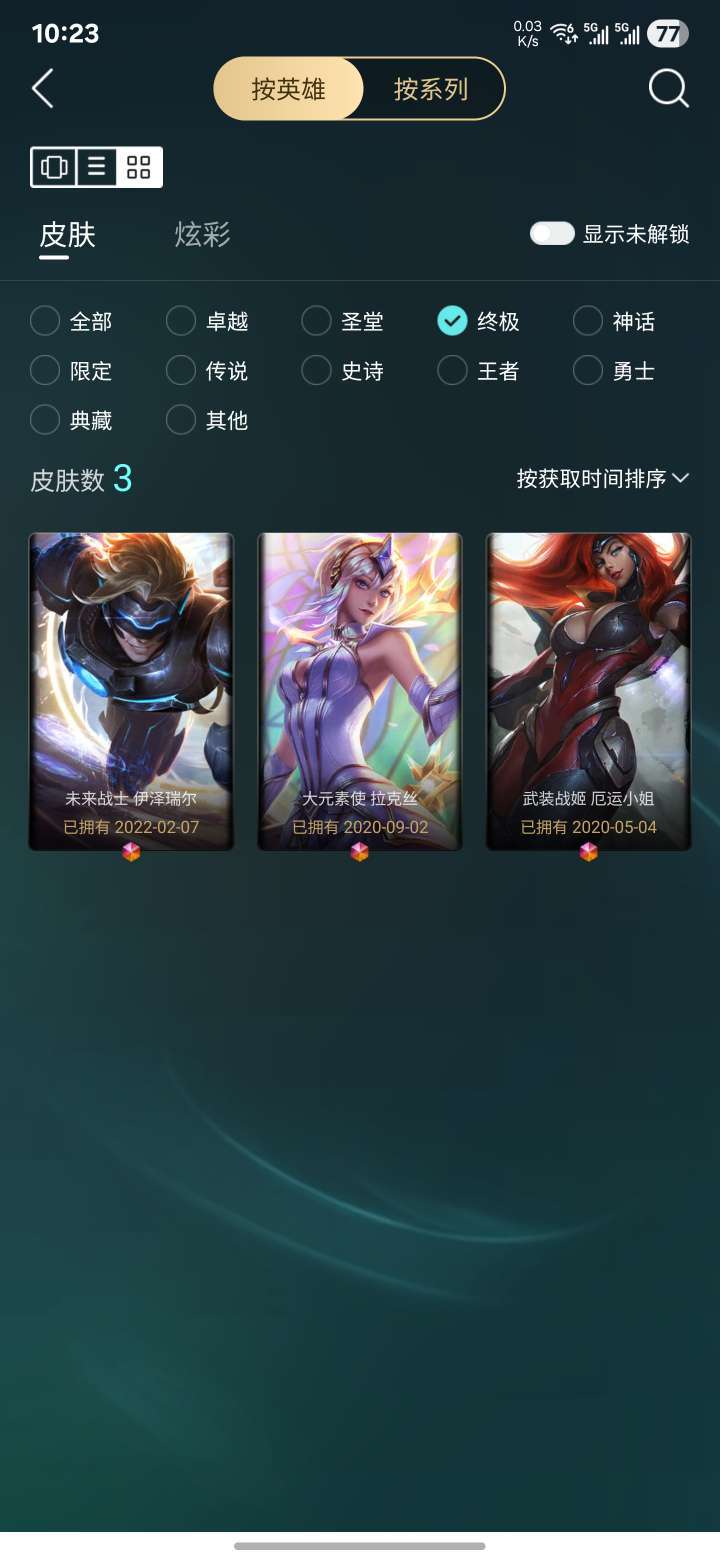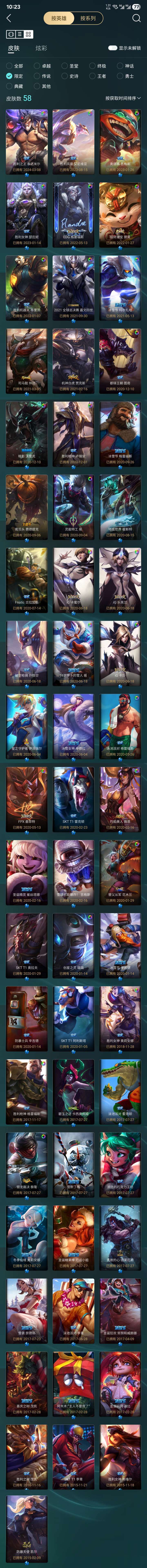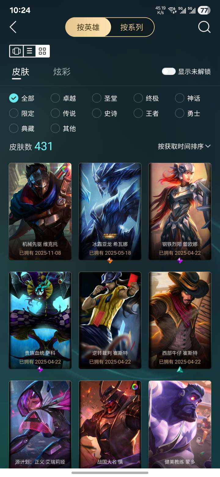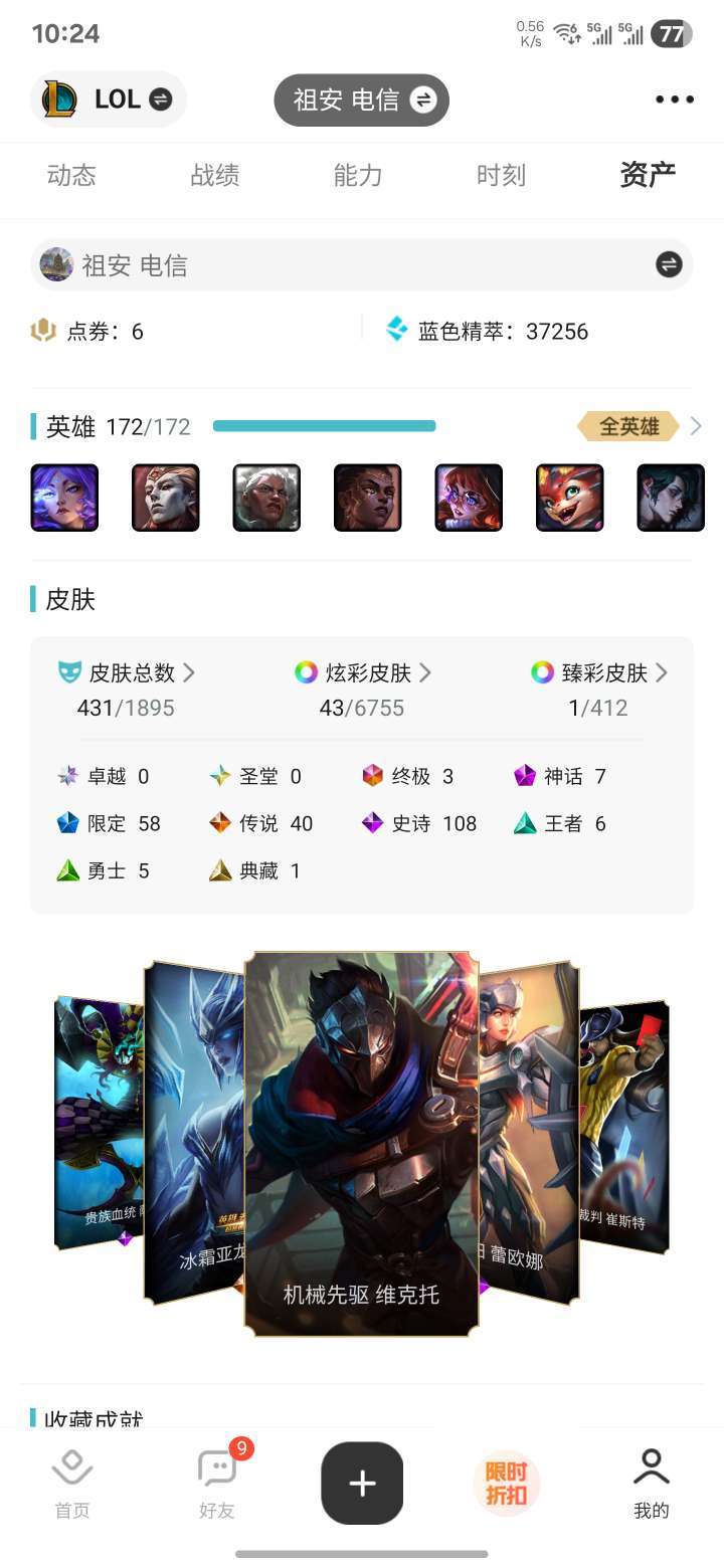 总皮肤400+,炫彩40+,至臻压缩,各种限定,主流英雄皮肤都有