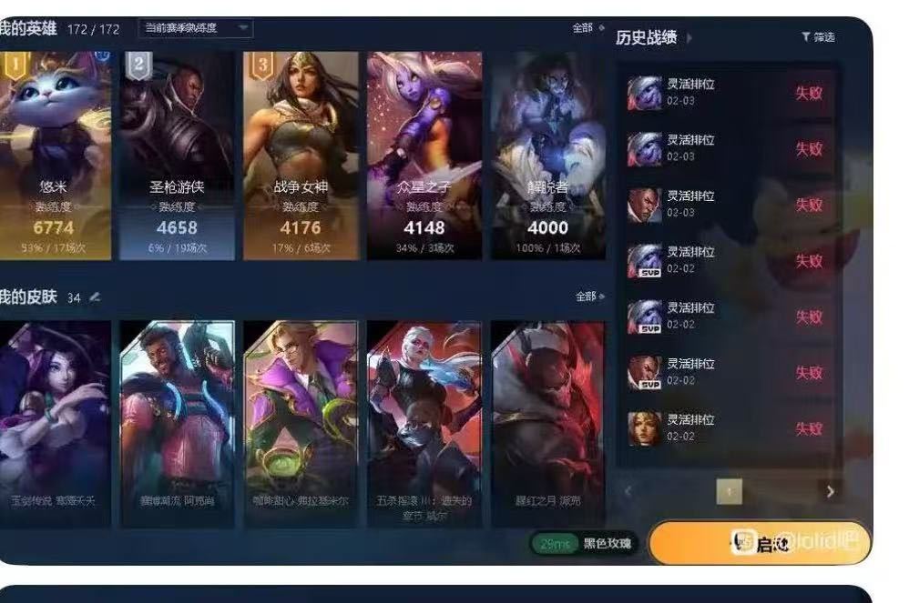 装备描述:黑色玫瑰全英雄账号,皮肤不多,单双白银4,灵活青铜4