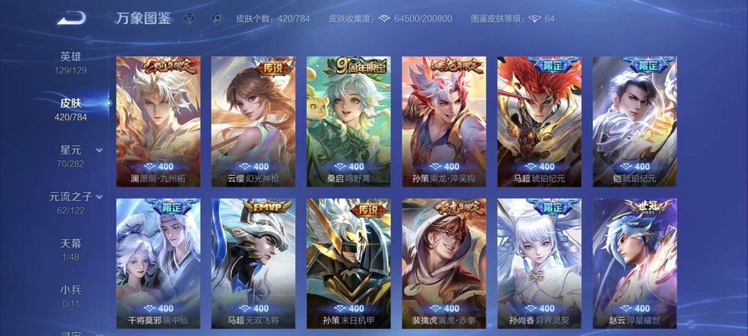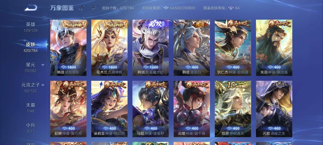 装备描述:V9 420P三典藏一无双//马年全套/马超全皮/韩信全皮/龙限孙策/蛇限澜