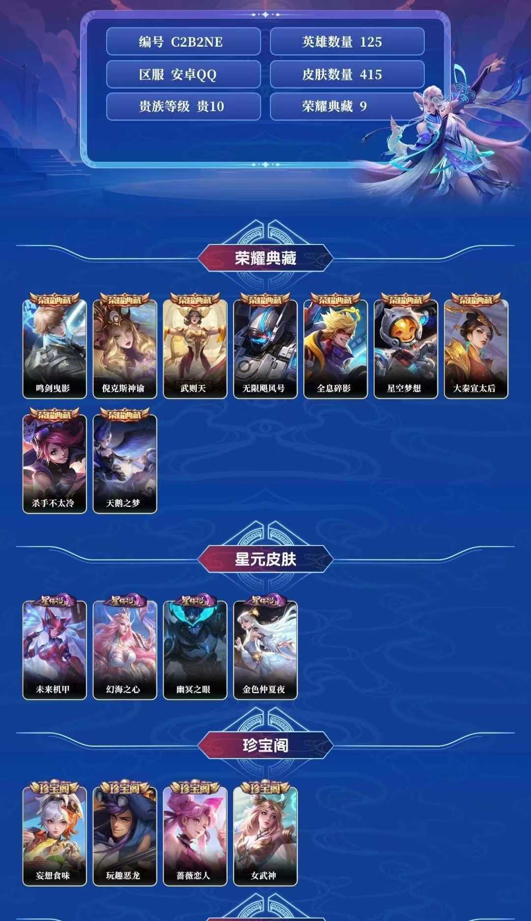 限制: 租号5次及以上 |装备描述:【C8】贵族V10~420皮9典藏38传说炽霜斩,祈雪灵祝,武圣,神威,至尊宝,凤求凰,梅西,白虎志,天魔缭乱【荣耀典藏】:鸣剑·曳影,倪克斯神谕,星空梦想,全息碎影,杀手不太冷,天鹅之梦,无限飓风号,大秦宣太后