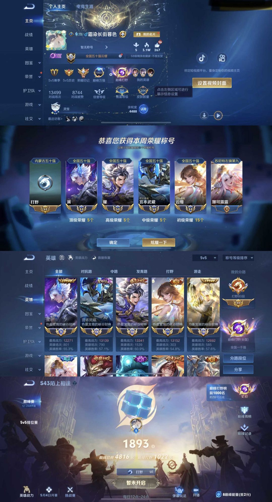 4小国50澜曜宫本武藏云缨在榜⭐巅峰1893闪电框⭐80段打野⭐可排禁巅峰