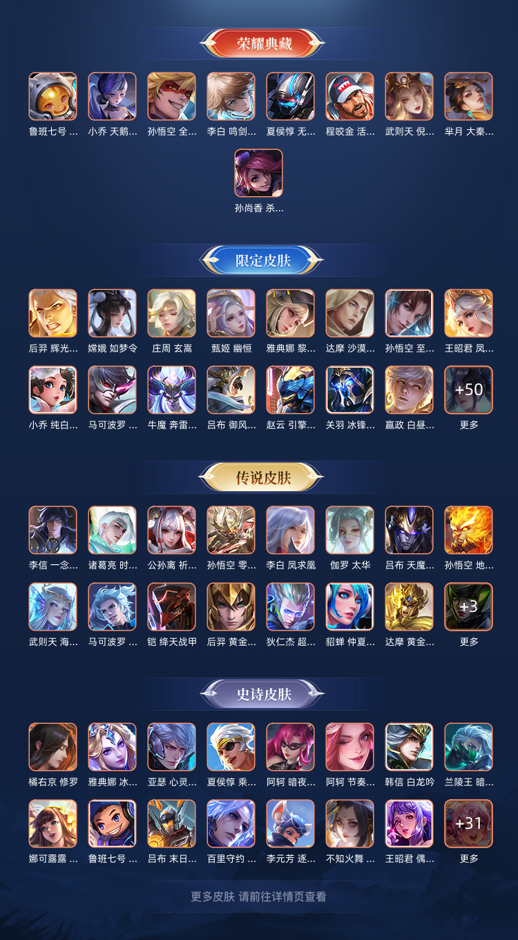 限制: 撤单率<50%才可租用此帐号装备描述:✅ 全英雄解锁:129/129 全英雄,全位置畅玩无限制! ✅ 荣耀典藏(9 款): 李白・鸣剑曳影、武则天・倪克斯神谕、程咬金・活力突击、夏侯惇・无限飓风号、孙悟空・全息碎影、鲁班七号・星空梦想、孙尚香・杀手不太冷、小乔・天鹅之梦、芈月・大秦宣太后 ✅ 无双皮肤(1 款): 铠・神罪 ✅ 热门传说皮肤(部分展示): 李信・一念神魔、曜・云鹰飞将、花木兰・冠军飞将、宫本・地狱之眼、孙尚香・末日机甲、貂蝉・仲夏夜之梦、李白・凤求凰、吕布・天魔缭乱、孙悟空・地狱火、后羿・神树通天、诸葛亮时雨天司等 ✅ 星传说(5 款): 虞姬・无限倾慕、周瑜・时之思念、貂蝉・幻海之心、宫本・幽冥之眼、貂蝉・金色仲夏夜 ✅ 额外内容:387 款皮肤,77 级精英收藏家,图鉴等级 98 级,限定灵宝、特效拉满