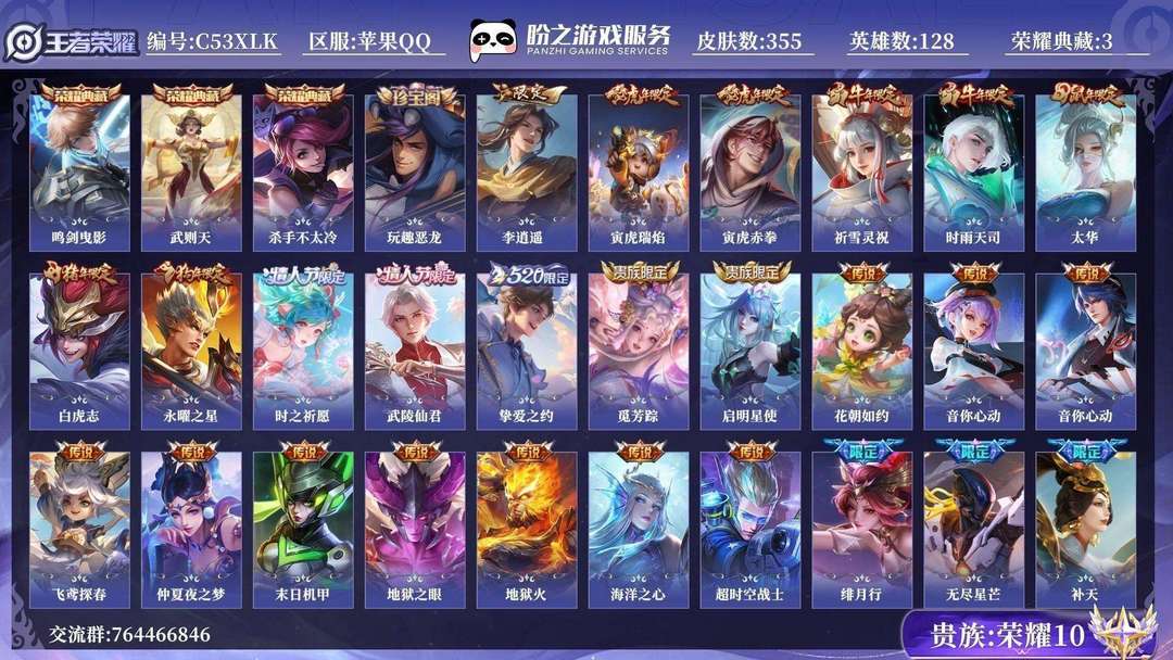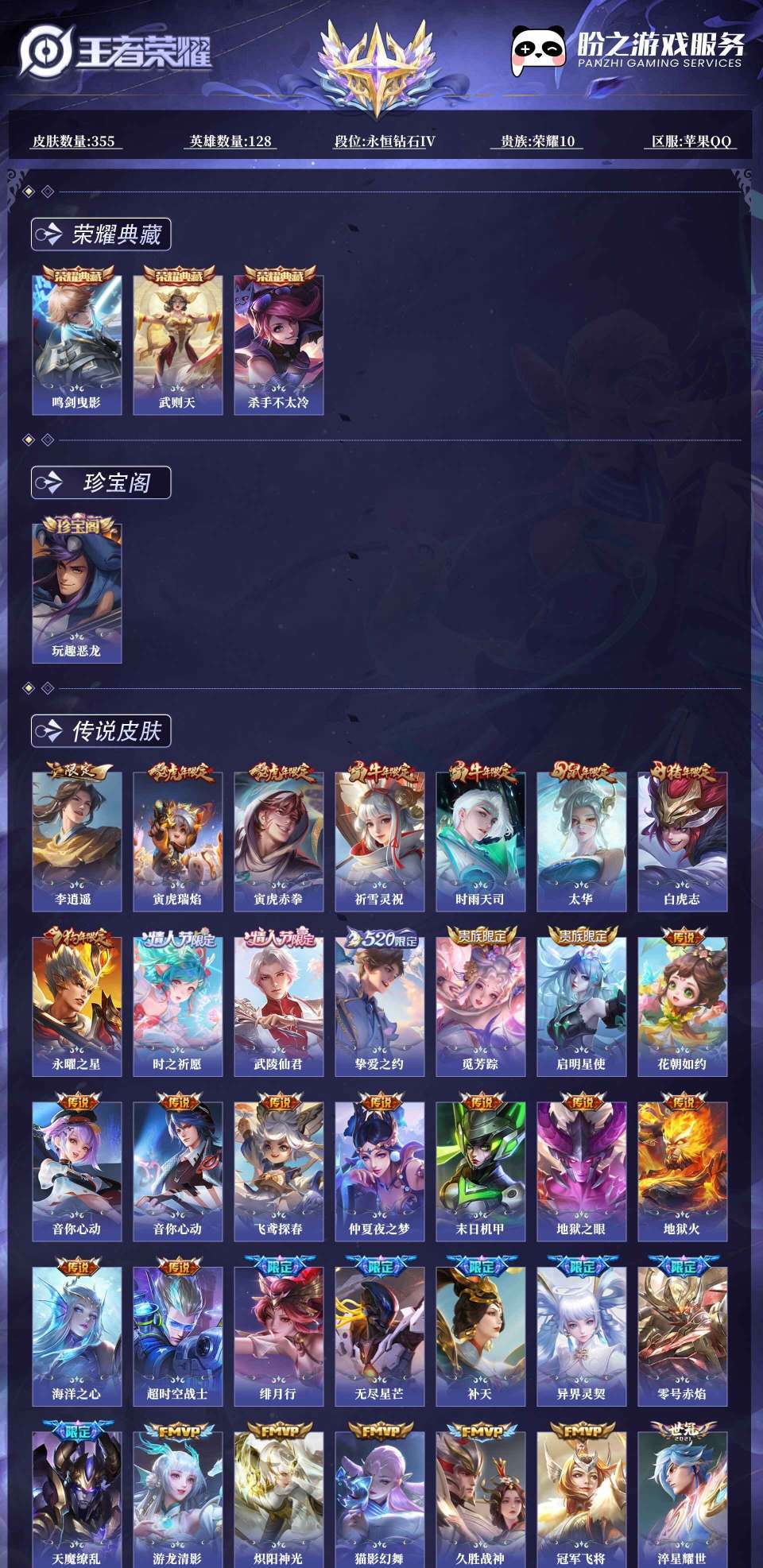 装备描述:贵族荣耀10 荣耀典藏3 传说皮肤39 史诗皮肤119 皮肤数量355 皮肤价值:35万 英雄128 永恒钻石IV 总场次9255