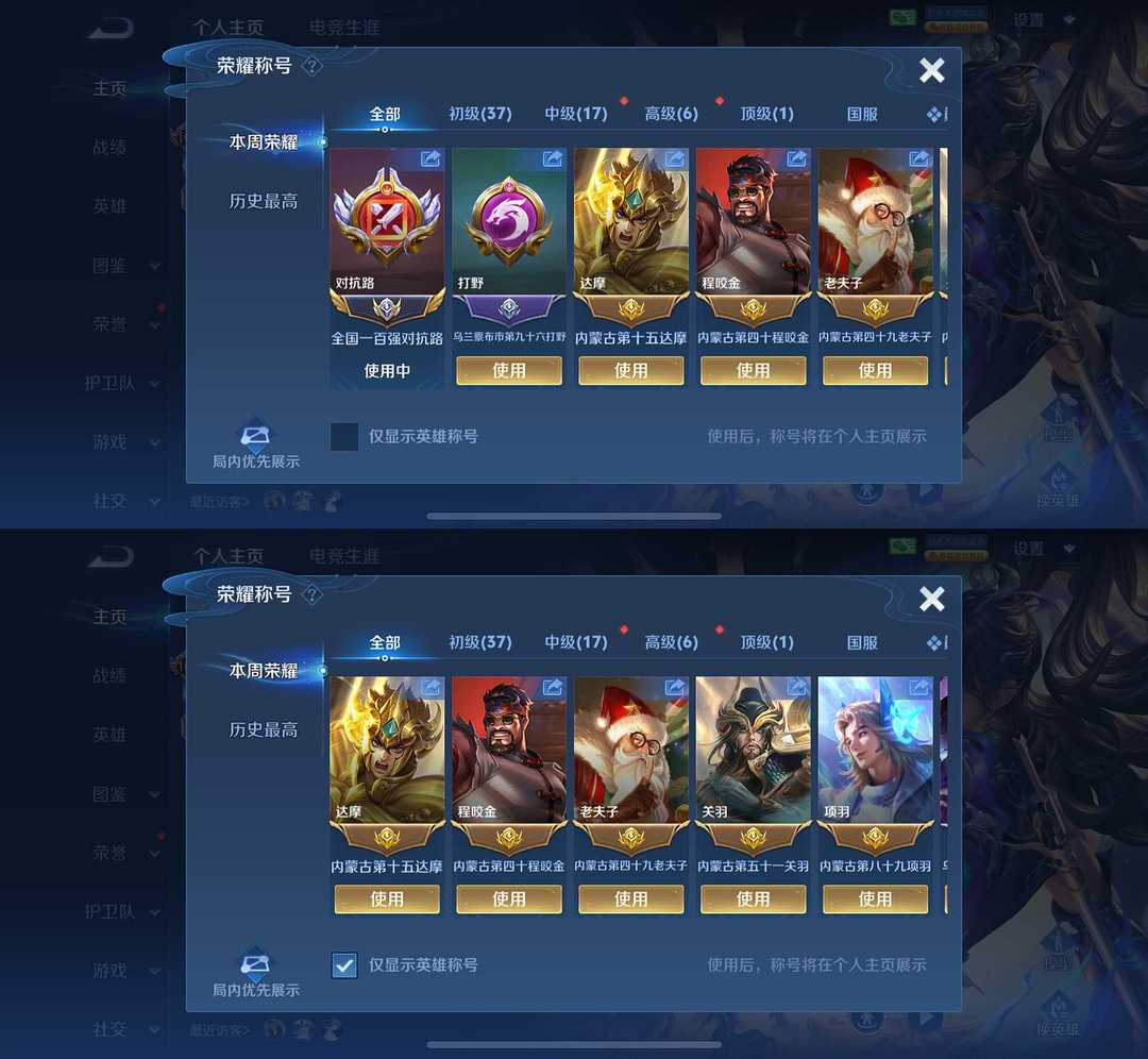 (禁玩巅峰赛)本周关羽,达摩,老夫子,程咬金,项羽5个省标在榜,103段国服在榜对抗路,历史3大国标