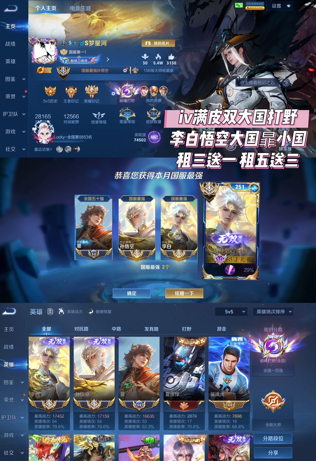 王者荣耀正式服,4月在榜大国孙悟空,李白,两大国服,全满皮巅峰打野,闪电框,魔方头像框。