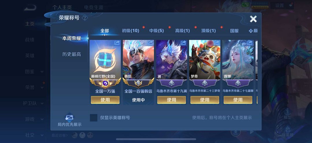 (禁玩巅峰赛)本周韩信小国标在榜+巅峰万强闪电框,孙悟空无双限定皮肤,历史5个小国标,瑶典藏,至尊宝