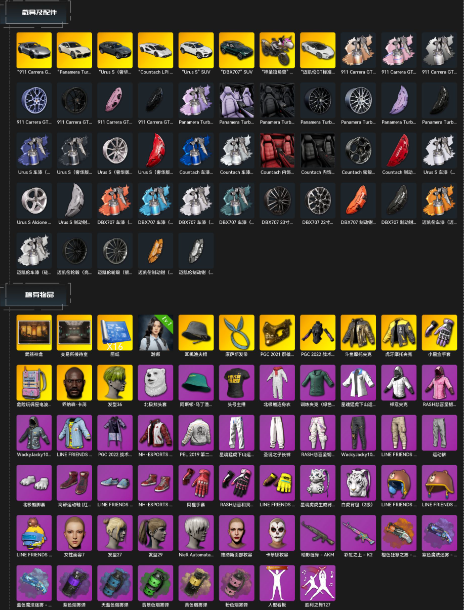 装备描述:【10满级13神器】满兰博/保时捷911和轿跑/迈凯伦/马丁SUV/满级异色美杜莎M762/满级霓虹AUG/满级孙悟空M24/满级恶魔猎手ACE/满级朱雀M416/满级玩偶屋SLR/满级刻耳柏洛斯M249/满级玄武SKS/满级沙悟净/满级唐三藏锅/4级赛搏MK12/午夜惊魂98K/寒蚀MP5K/紫橙蓝魔法迷雾M79/紫蓝绿黄粉彩色烟雾弹/小黑盒手套/斗鱼夹克/虎牙夹克/瀚娜/尼尔9s/星魂白运动/拉风龙大礼包/黑鬼/发光套/白战神/小战神/悲喜套/布朗熊大礼包/西游记全套/电磁包/绿东/大金牙/大绿头/熊脚/音响舞/萨克斯舞