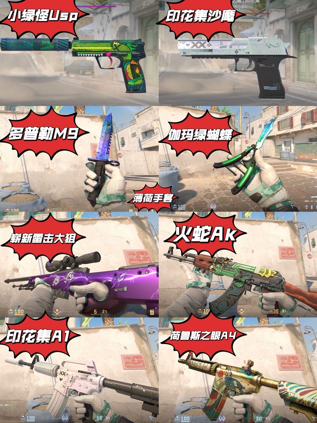完美b双刀❤️薄荷❤️伽玛蝴蝶+多普勒M9❤️火蛇Ak❤️崭新雷击大狙❤️印花集A1❤️荷鲁斯A4