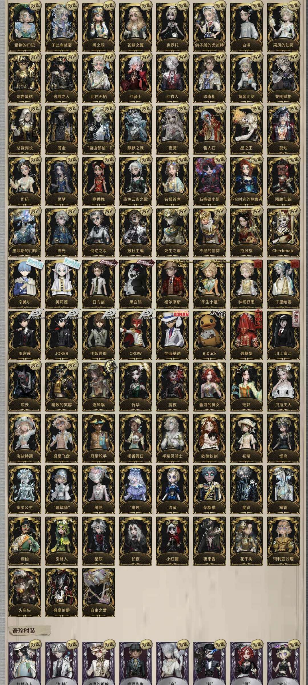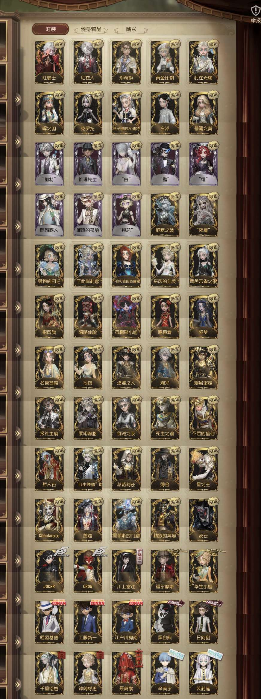 装备描述:满氪共享7真理 佣兵3限 先知白 鸽子 克罗托 静默之戟 白泽 苍鹭之翼 红衣人 此在无栖 柯南 弹丸 p5 高配 迷雾山庄精装修带大件,有一念之间 【撤二级的拉黑,禁止游戏内卖共享,搞禁言的拉黑】 【4月5日,好友位已清,目前剩240+好友位】 晖之羽 鸽子般的尤迪特 克罗托 静默之戟 白泽 苍鹭之翼 石榴裙小姐 寒香舞 猎物的印记 珍奇柜 + 红衣人 红骑士 黎明赋格 黄金比例 总裁判长 “夜魔” 自由领袖 星之王 薄金 哲人石 千里绘卷 钟阁杼思 日向创 黑白熊 “华生小姐” 福尔摩斯 JOKER、CROW、怪盗基德、B.Duck 侦探装:柯南 工藤新一