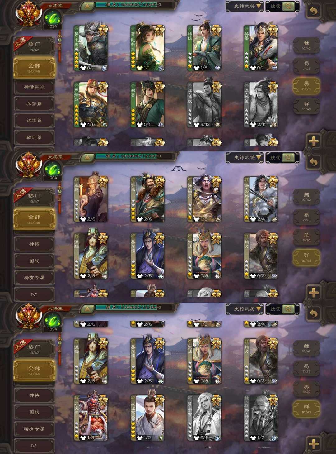 装备描述:大将军梦枕千秋回廊动态友诸葛亮/势魏延/操刀必割动态界徐盛/荡然由心谋曹丕/势太史慈/张奋/动态谋关羽/动态沙摩柯/动态势陆郁生等史诗,有势黄祖,动态谋黄月英,星徐晃,势张燕,势孙韶等强力精品